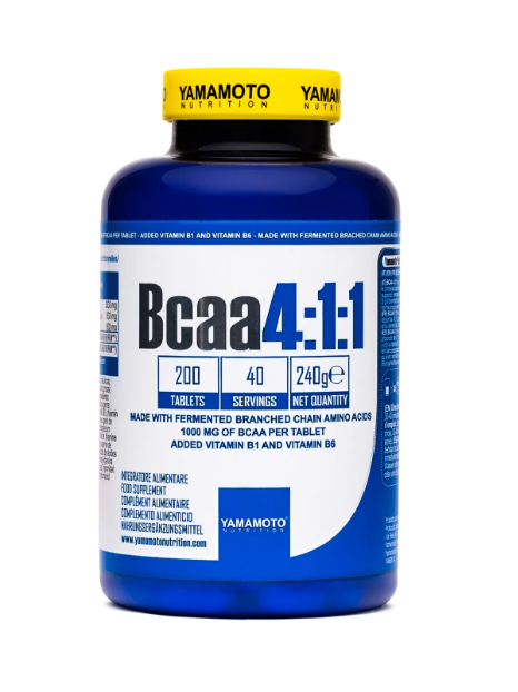Yamamoto® Nutrition BCAA 4:1:1 è un integratore alimentare di aminoacidi a catena ramificata con vitamine B1 e B6. Il prodotto è stato realizzato nell'innovativo rapporto 4:1:1 (4 parti di L-Leucina, 1 di L-Valina e 1 di L-Isoleucina). Gli aminoacidi ramificati sono indicati per integrare la dieta degli sportivi che si allenano quotidianamente. La formula è inoltre arricchita con la vitamina B1 che supporta il normale metabolismo energetico e la vitamina B6 che contribuisce alla riduzione di stanchezza e affaticamento, ed al mantenimento del normale metabolismo delle proteine e del glicogeno.