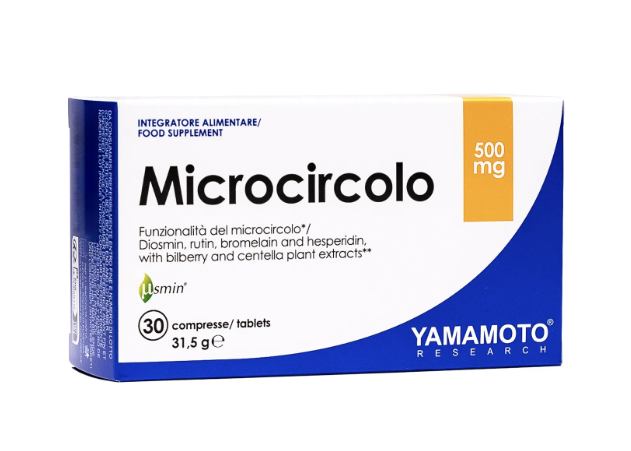 Yamamoto® Research Microcircolo New Formula è un integratore alimentare a base di diosmina micronizzata μsmin® (innovativa formulazione di diosmina con superiore assorbimento e disponibilità), rutina, bromelina ed esperidina, con estratti vegetali di mirtillo nero e centella asiatica.