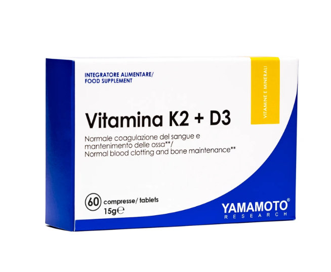 Yamamoto® Research Vitamina K2 + D3 è un integratore alimentare a base di vitamina K2 e vitamina D3 ad alto dosaggio, che può essere utilizzato in tutti i casi di aumentato fabbisogno o diminuito apporto di queste vitamine. La Vitamina D3 è fondamentale per il supporto alla salute di ossa e denti, il sostegno al sistema immunitario e per prevenire l’insorgenza di patologie cardiovascolari, mentre la vitamina K2 contribuisce alla normale coagulazione del sangue e al mantenimento di ossa in salute.
